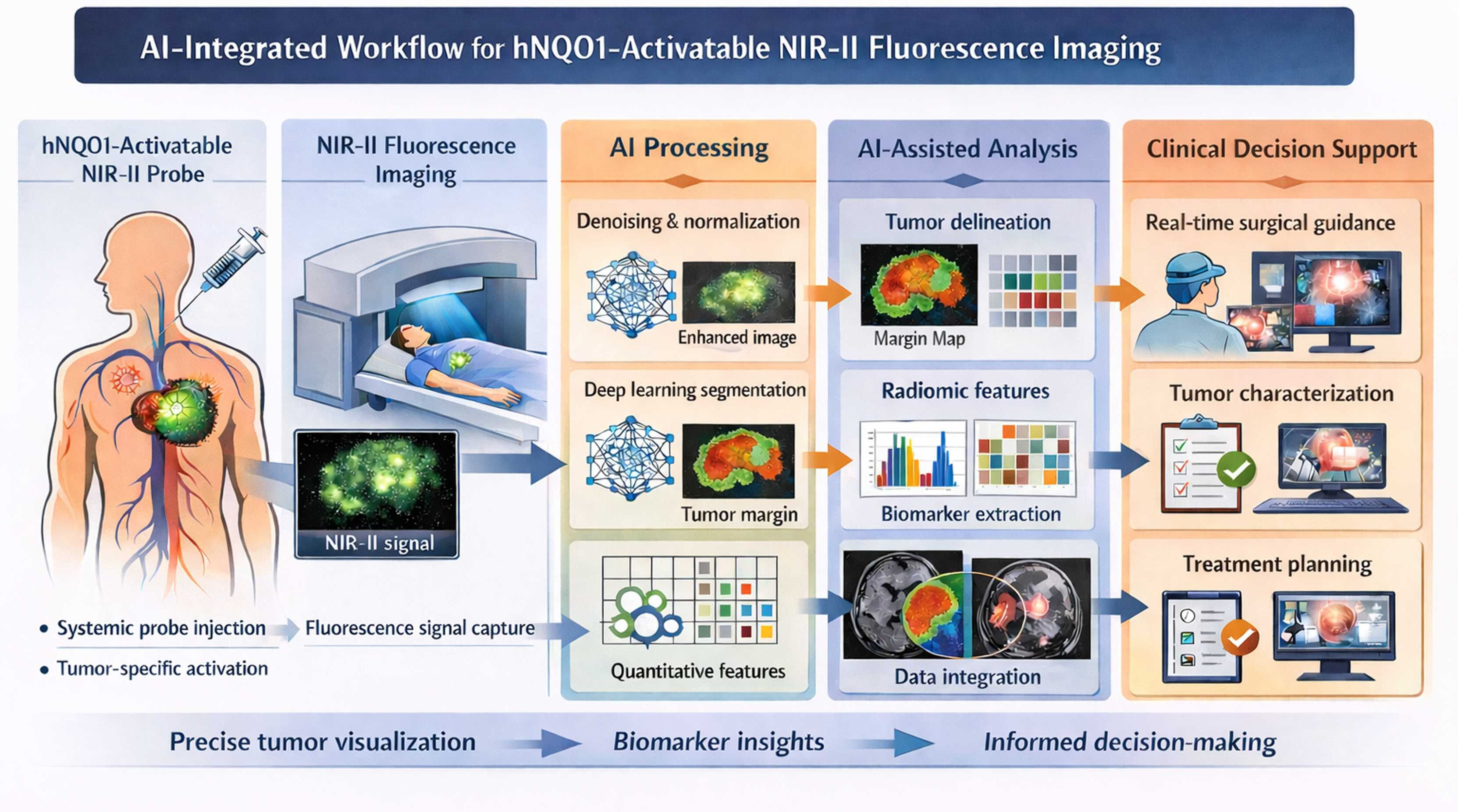 The authors envision an intelligent oncology workflow that fuses hNQO1‑activated fluorescence with multimodal imaging (MRI, PET, CT) via advanced AI frameworks. Key goals include: